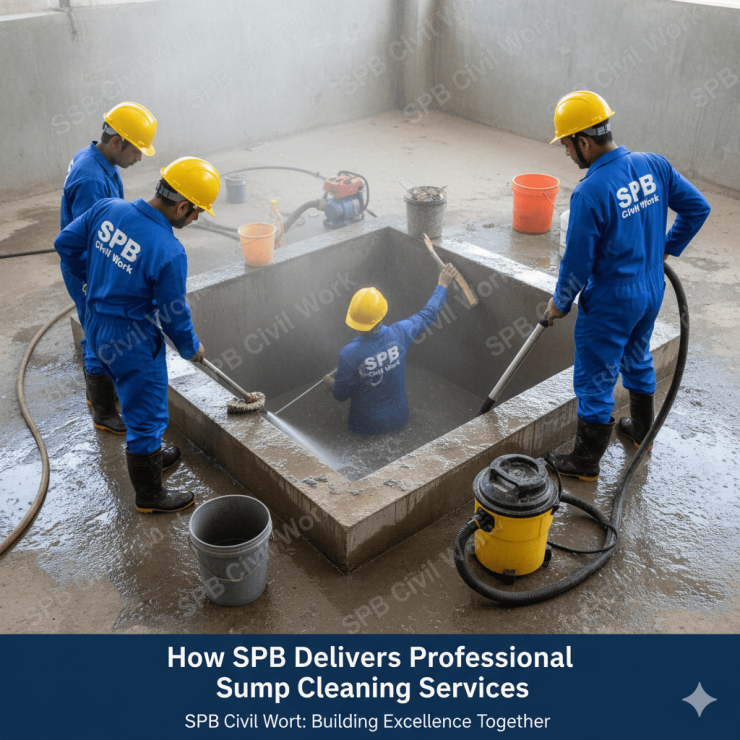 When it comes to sump cleaning, you need more than just emptying the water. A professional cleaning removes dirt, algae, bacteria, and slime that build up inside the sump over time. This is where SPB Civil Work & Cleaning Services makes the difference.